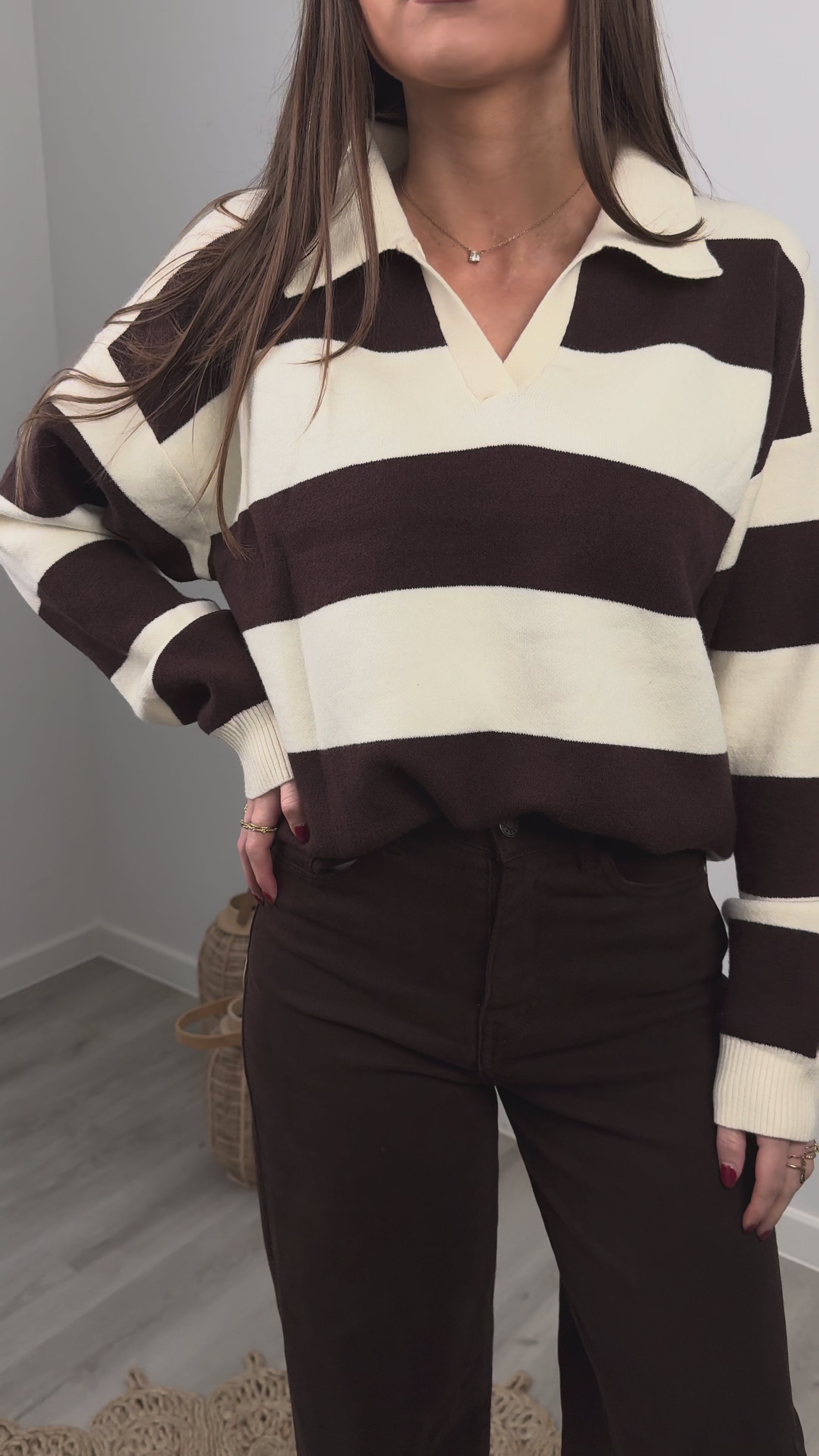 Super comfy polo-knit met brede strepen in een warme crème-bruine combo. 🤎