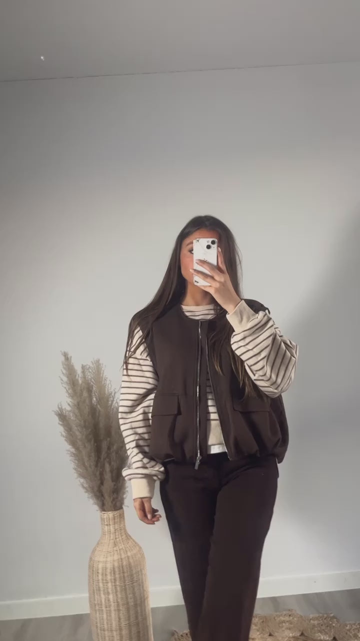 Stoer en comfortabel, dit donkerbruine vestje met rits en zakken is perfect voor laagjes in het najaar. Het heeft een losse fit en valt soepel over elke outfit. Combineer het eindeloos voor een casual, maar stijlvolle look. Ready to shine!