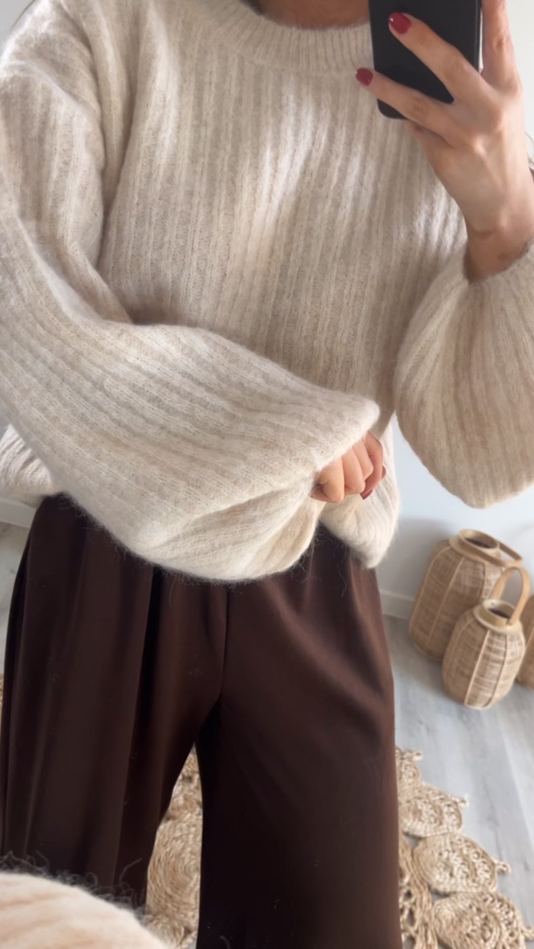 Deze cozy knit trui is superzacht, mega comfy en heeft die mooie grote ballonmouwen waardoor ie echt luxe oogt 🤍 De crème kleur past letterlijk op alles: van rokjes tot jeans. Je gooit ’m aan en je outfit ziet er meteen goed uit!