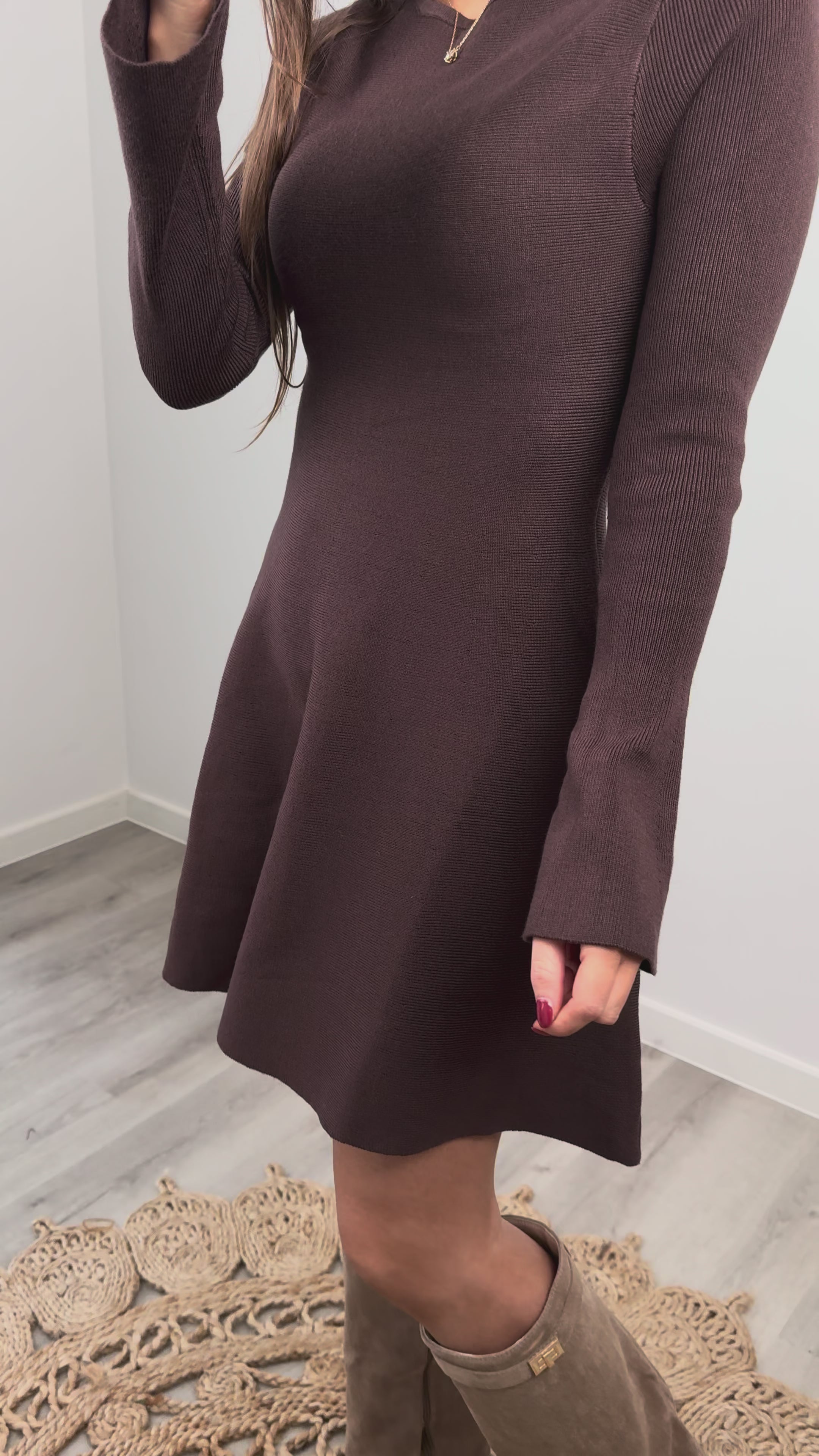Dit chocoladebruine kleedje is pure elegance in een comfy jasje: stretchy, flatterend en met die leuke uitlopende mouwtjes. De A-lijn snit geeft je meteen een mooie, vrouwelijke shape zonder moeite. Perfect voor dates, feestjes of gewoon wanneer je cute wilt zijn 🍫.