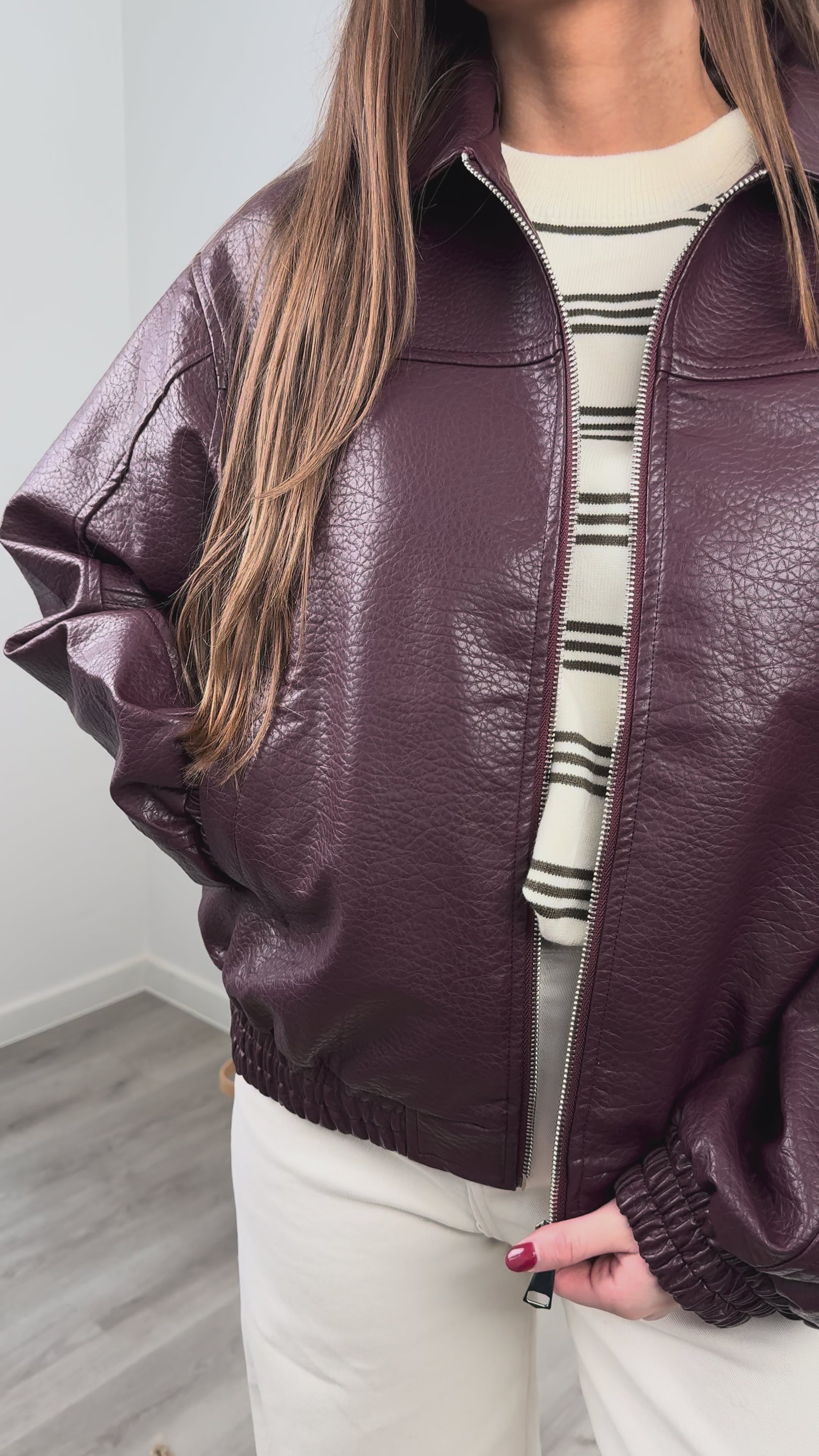 Super mooie faux-leather bomber in een diepe bordeaux tint :echt een eye-catcher. 🍷