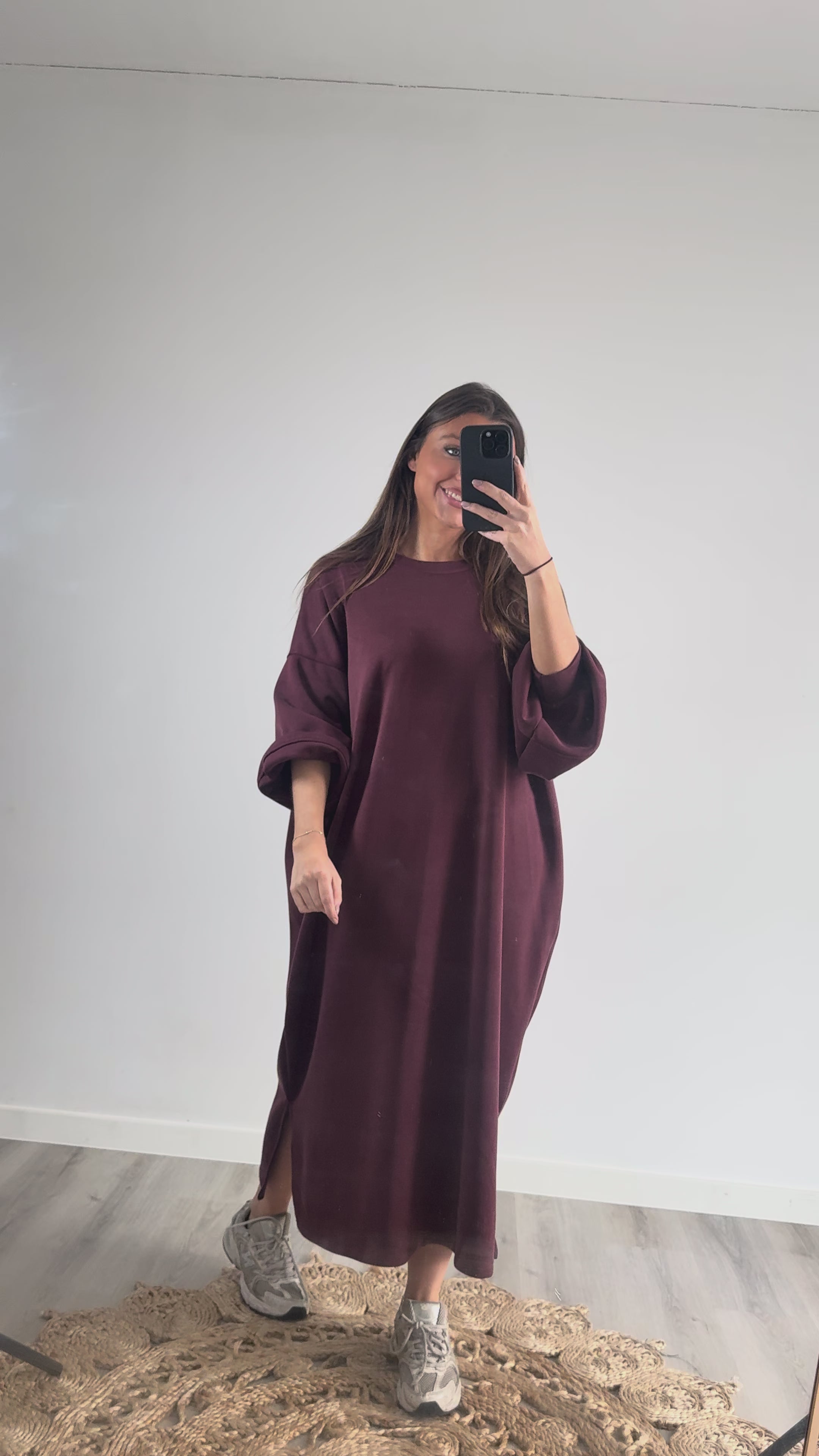 Sweaterjurk in diep bordeaux en een geweldig stofje! Oversized fit met lange mouwen en handige zakken. Draag ’m met sneakers of laarzen voor een comfy everyday look ✨.